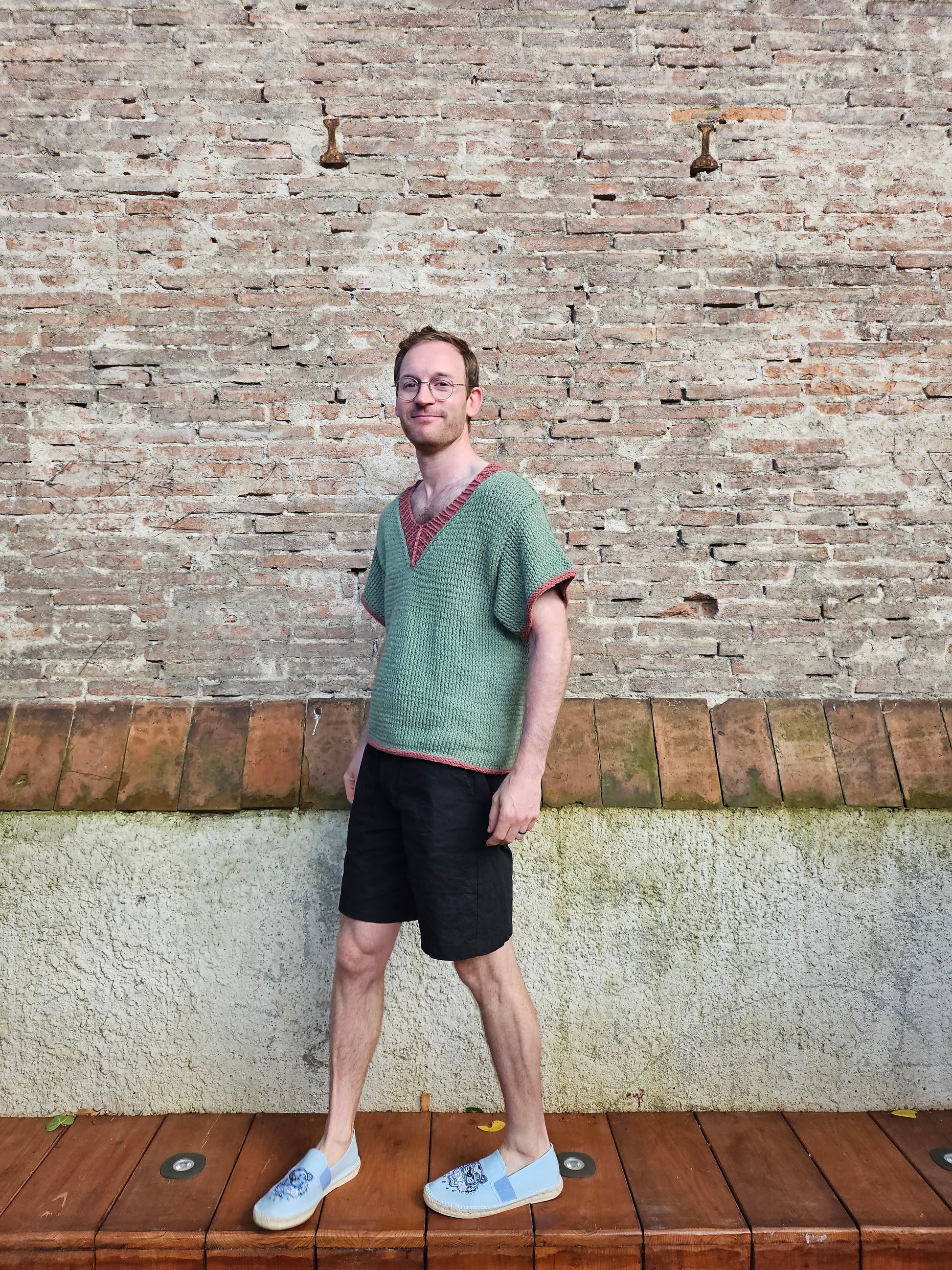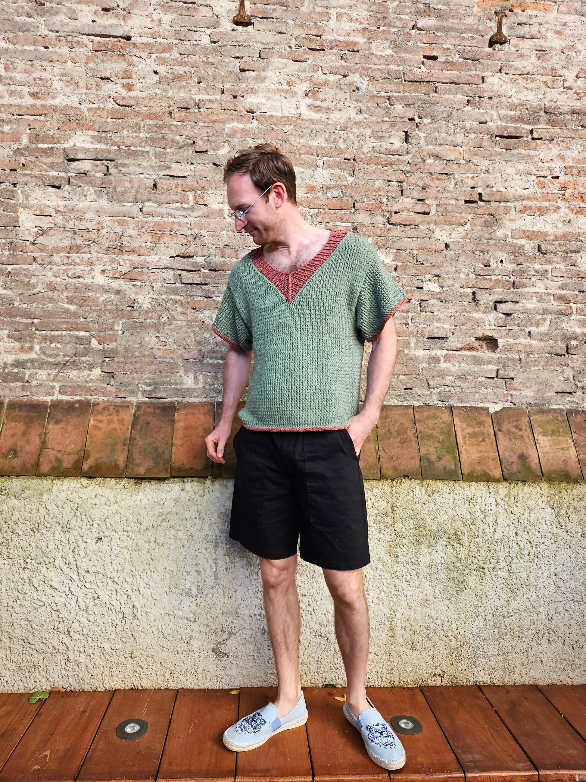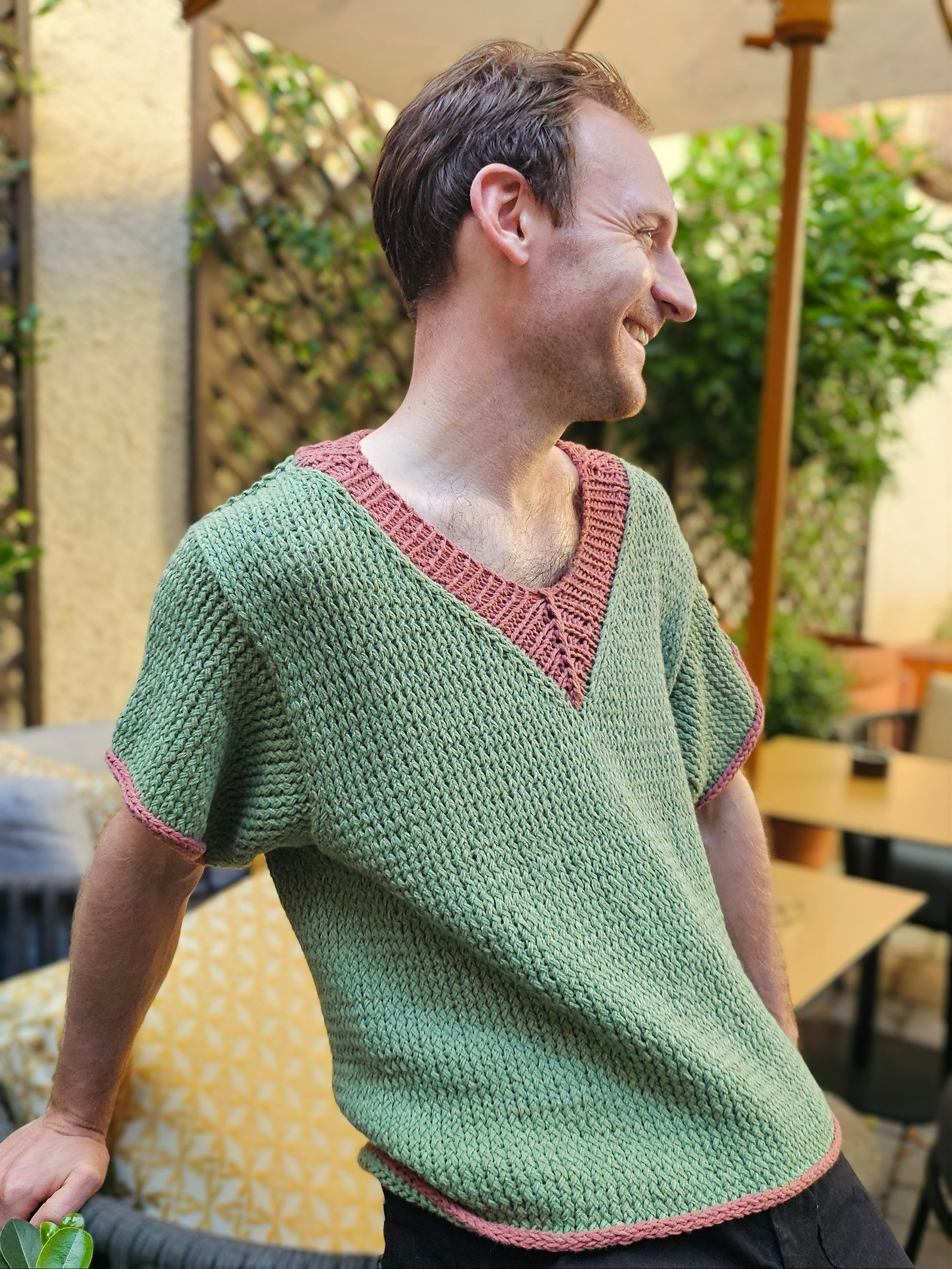 This short sleeve Tee is knitted with (MC) two strains of summer wool (wool and cotton mix) held together. This makes a between chunky DK and worst weight strand. The edge and the V-neck is knitted with contrast colour.